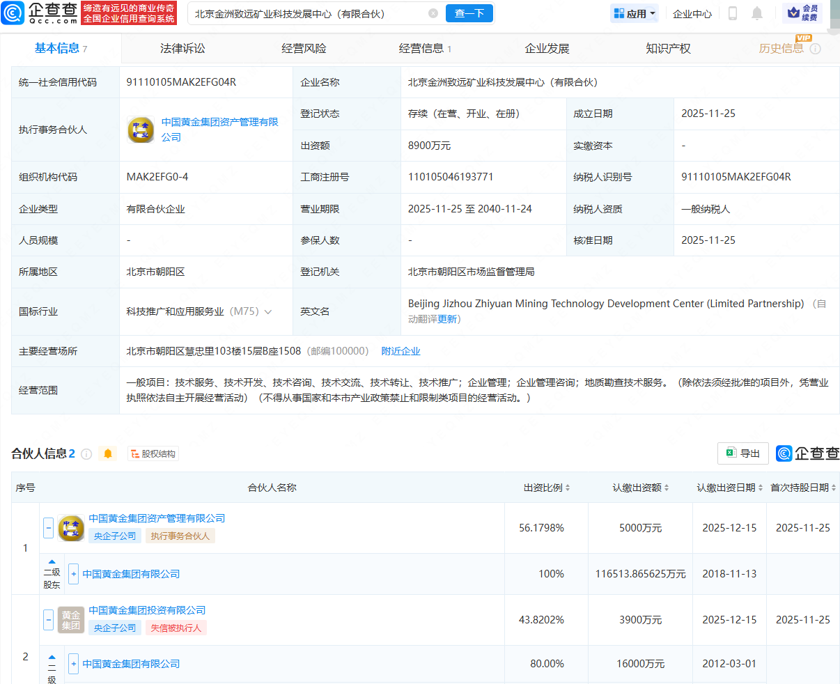 近日,北京金洲致远矿业科技发展中心(有限合伙)成立,出资额8900万元,经营范围包含:企业管理;企业管理咨询;地质勘查技术服务等。企查查股权穿透显示杠杆股票是什么,该企业由中国黄金集团有限公司旗下中国黄金集团资产管理有限公司、中国黄金集团投资有限公司共同持股。