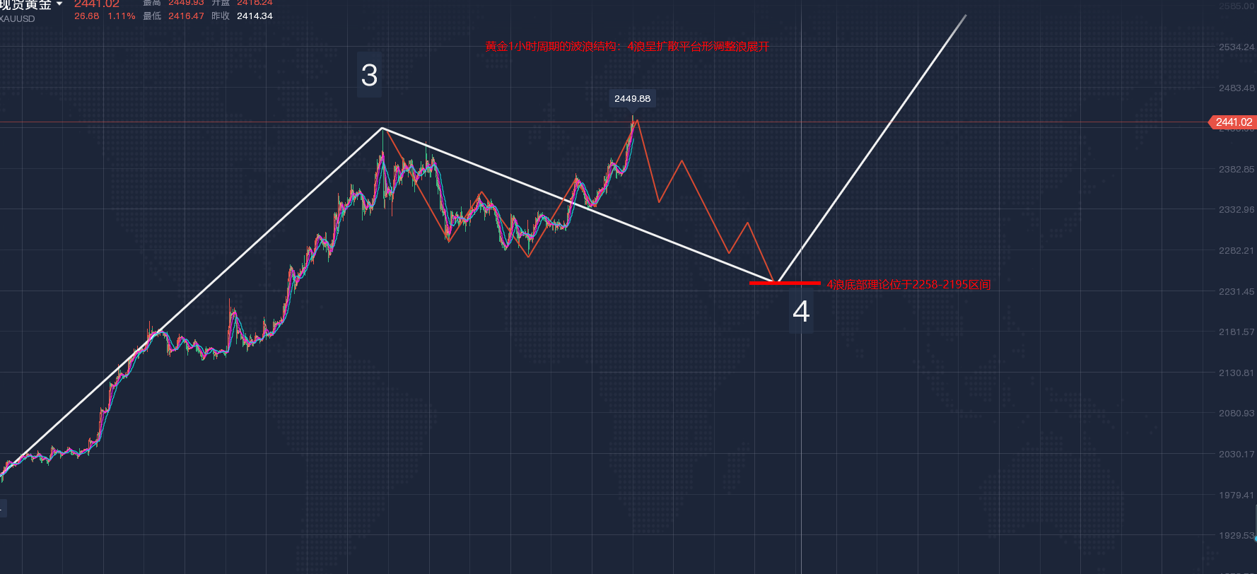 若行情继续上破2449一线,则顺势先看2490一线,若破位2490则说明4浪调整已于2277附近提前结束,行情处于大一别的5浪上行之中,届时我们再做分析!